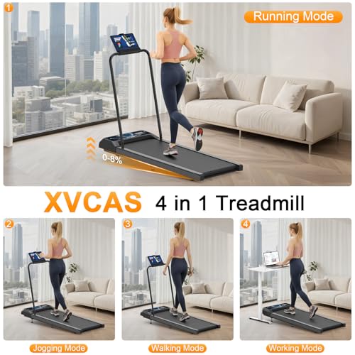 4-in-1 Modes and Control: XVCAS walking mat treadmill with 0-8° incline, offers 4-in-1 modes, suits home aerobics, jogging, running and walking; Controlled via APP or remote, this foldable treadmill fits workout equipment for home or office