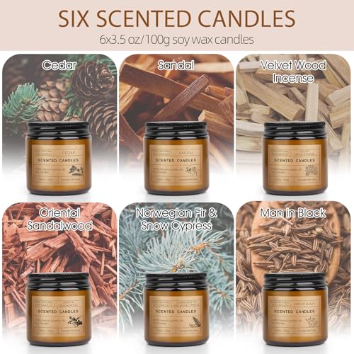 【6 Pack Aromatherapy Candles Set】- Scented candle pack contains 6 aromas of scents: MAN IN BLACK, ORIENTAL SANDALWOOD, CEDAR, SANDAL, NORWEGIAN FIR AND SNOW CYPRESS, VELVET WOOD INCENSE. Warm candlelight and scents ideal for yoga, bath, office, living room, bedroom, bathroom, spa, hotel, etc.This scented candles makes an ideal gift for christmas birthday.