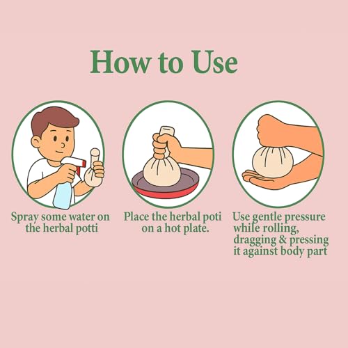 DIRECTION TO USE: Place the herbal potli on a hot plate or dampen the base by spraying fresh water on it. Use gentle pressure while rolling, dragging & pressing it against on affected areas.