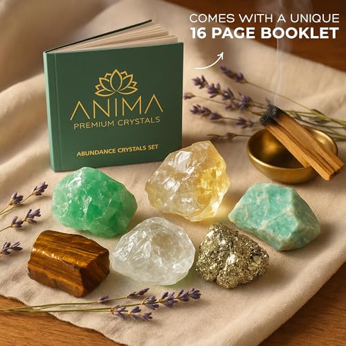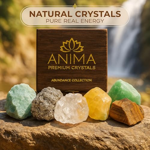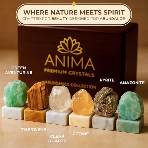 Anima Premium Abundance Healing Crystals Set for Success & Good Luck – Large Raw Citrine, Pyrite, Tigers Eye, Green Aventurine, Amazonite & Clear Quartz – Wooden Gift Box and Guide Booklet Included